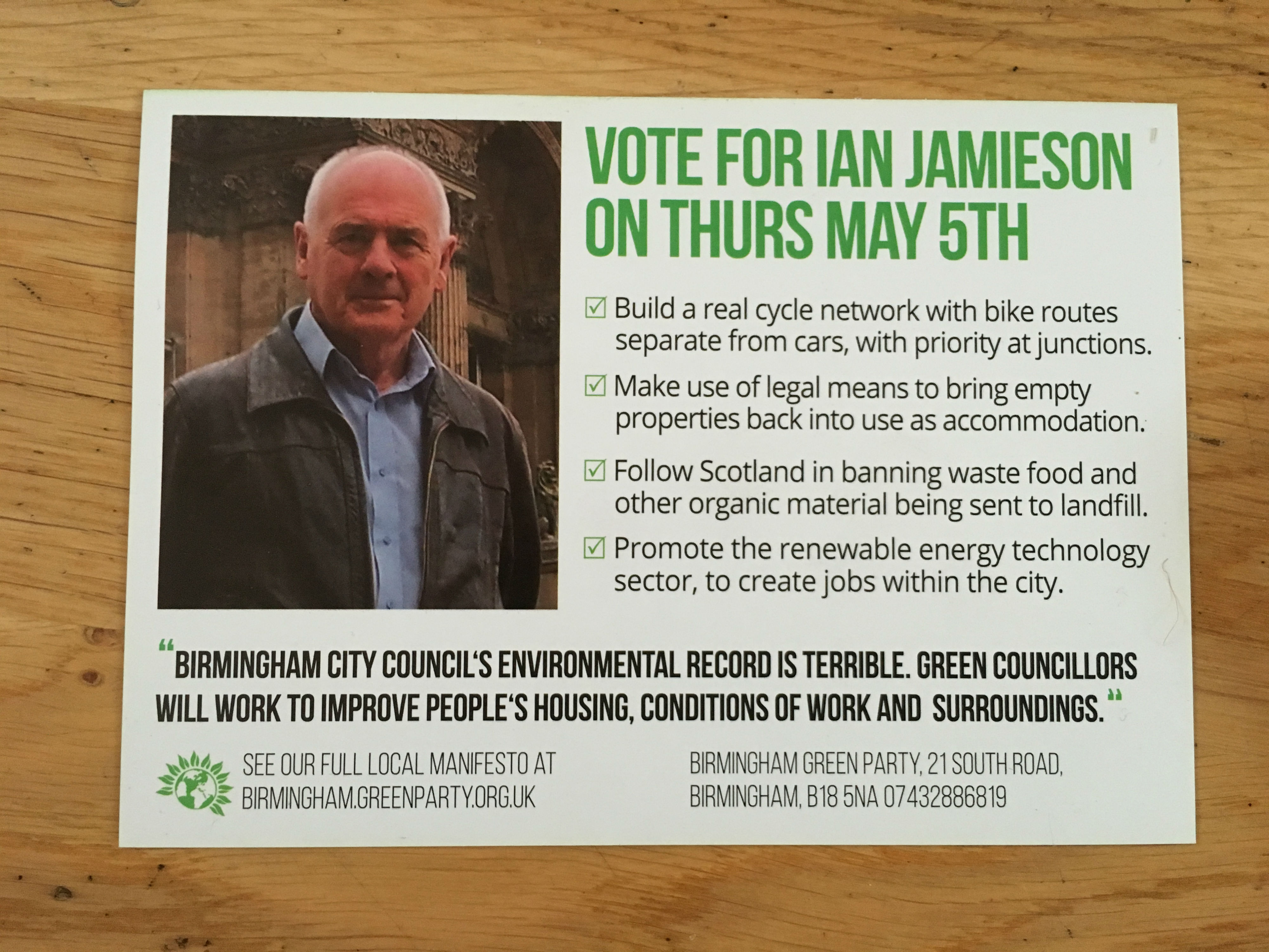 I think Ian might have missed a memo here - he seems to have confused standing as a ward councillor with standing as the city mayor. Whilst it's obviously important to know what a party's platform for the city might be, what I really want to know is what the particular candidate's platform for my local area is in a local election. Perhaps these are indeed his pledges for Cotteridge, Stirchley, and Bournville?